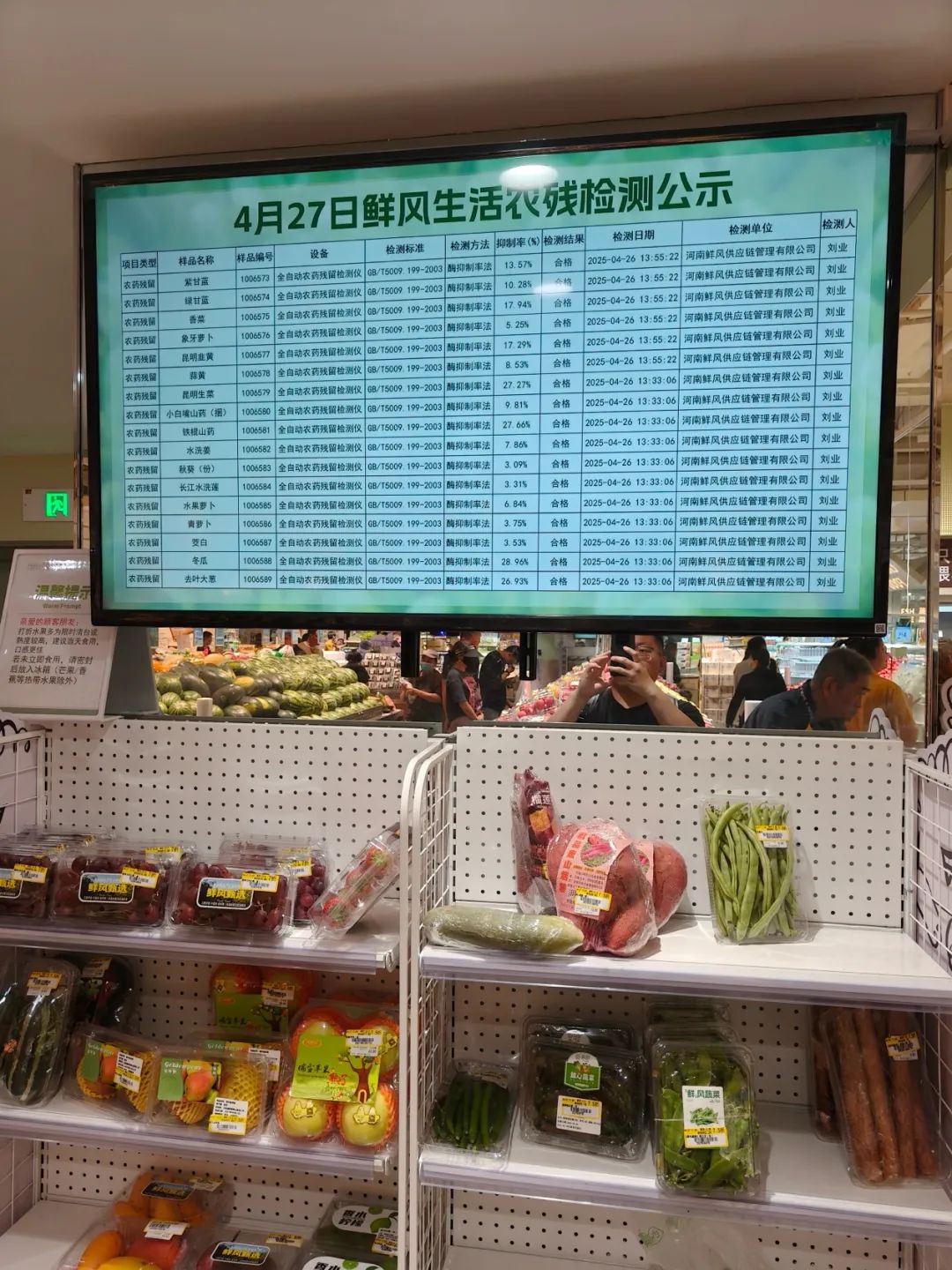 遵循“健康有機(jī)”的生鮮理念,鮮風(fēng)生活會(huì)用大屏幕在生鮮區(qū)公示當(dāng)日生鮮蔬菜的農(nóng)藥殘留檢測(cè)數(shù)據(jù),消費(fèi)者還可以直接用微信掃碼查看葉菜生鮮的農(nóng)殘數(shù)據(jù)。
