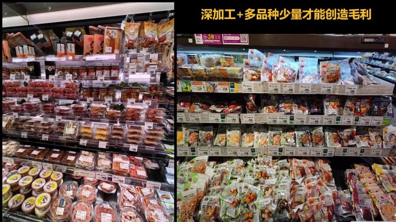 第五,建立以3R食品、深加工果蔬品、烘焙、速凍食品等加工商品體系,無(wú)生鮮不加工,不加工不盈利的理念深入人心,使生鮮成為高毛利的品類。