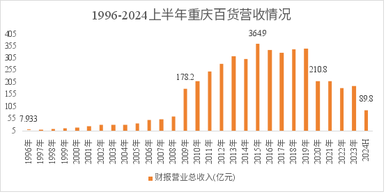 上市后資本市場(chǎng)開(kāi)拓階段(1996-2016年):1996年,重慶百貨于上交所成功掛牌上市,當(dāng)年?duì)I業(yè)收入為7.93億元,在一系列市場(chǎng)化重組的操作下,2016年整體營(yíng)收達(dá)到頂峰:由2014年的301億元增長(zhǎng)到2015年的364.9億元(2015年財(cái)報(bào)數(shù)據(jù)修正,并入整合企業(yè))。