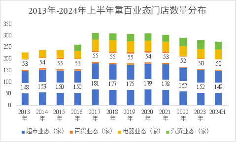 從經(jīng)營(yíng)業(yè)態(tài)門店數(shù)量來(lái)看,2017年重慶百貨的門店數(shù)量達(dá)到峰值311家,其中超市業(yè)態(tài)有181家,百貨業(yè)態(tài)有55家,電器業(yè)態(tài)有47家,汽貿(mào)業(yè)態(tài)有28家。2024年上半年門店數(shù)量共有274家,其中超市業(yè)態(tài)縮減明顯,減少至149家,減少了近20%;百貨和電器業(yè)態(tài)也有所減少,分別只剩50家店和41家店;汽貿(mào)業(yè)態(tài)門店數(shù)量是近六年來(lái)唯一增長(zhǎng)業(yè)態(tài),門店數(shù)量達(dá)34家。