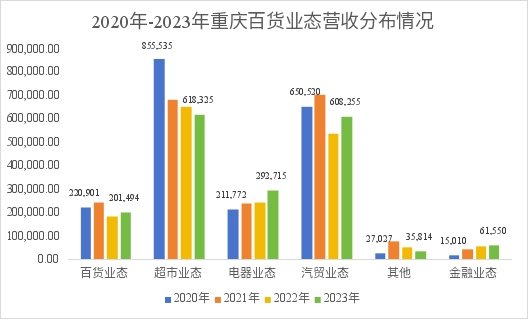 從經(jīng)營(yíng)業(yè)態(tài)營(yíng)收規(guī)模來(lái)看,超市業(yè)態(tài)在過(guò)去四年里下降明顯,由2020年的85.5億元下跌至2023年的61.8億元。電器業(yè)態(tài)增幅明顯,由2020年的21.1億上升至2023年29.2億元。金融業(yè)態(tài)(參股投資的馬上消費(fèi))營(yíng)收也逐年呈增長(zhǎng)態(tài)度,由2020年的1.5億元上升至2023年的6.15億元。百貨和汽貿(mào)業(yè)務(wù)整體略有下降,跌幅不到10%。