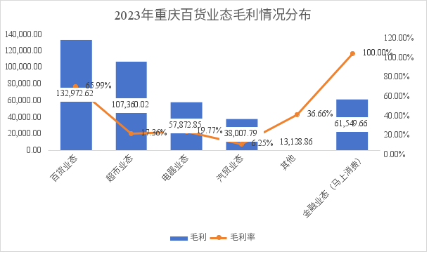 百貨業(yè)態(tài)整體營(yíng)收占比為11%,毛利貢獻(xiàn)占比32%。具備高毛利率、較強(qiáng)占有率的特性,因此這意味著該業(yè)態(tài)應(yīng)該作為公司最為的核心業(yè)務(wù),需要重點(diǎn)投入。