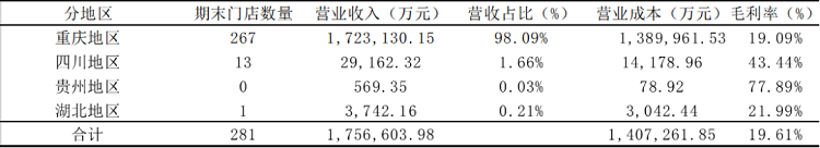 從經(jīng)營(yíng)區(qū)域來(lái)看,重慶百貨主要經(jīng)營(yíng)區(qū)域?yàn)橹貞c地區(qū),以2023年年報(bào)數(shù)據(jù)為例,重慶地區(qū)實(shí)現(xiàn)163.7億的營(yíng)收,營(yíng)收占比達(dá)到97.74%。四川、貴州和湖北地區(qū)累計(jì)只有3.78億元,占比不到3%,貴州地區(qū)唯一一家店也在2023年7月關(guān)停。