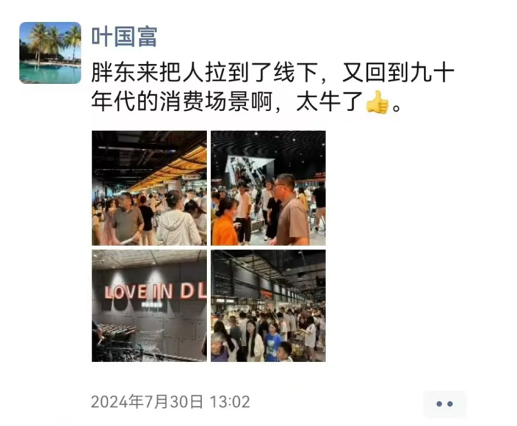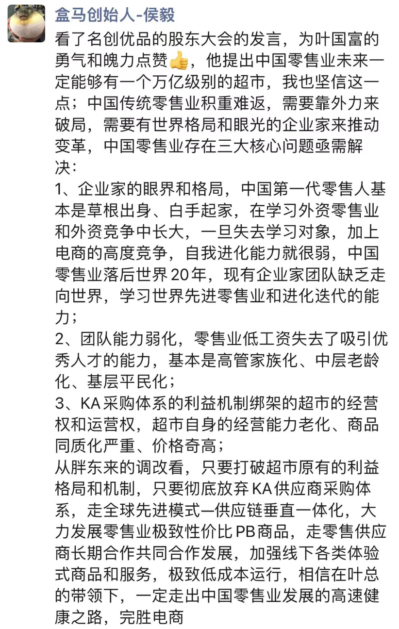 葉國(guó)富認(rèn)為,在走遍全球,看遍全球零售業(yè)態(tài)后,仍認(rèn)為更優(yōu)秀的零售模式在中國(guó),即胖東來(lái)模式,它是中國(guó)超市唯一的出路。早在七月底,葉國(guó)富就曾在朋友圈中對(duì)胖東來(lái)模式給予高度肯定。