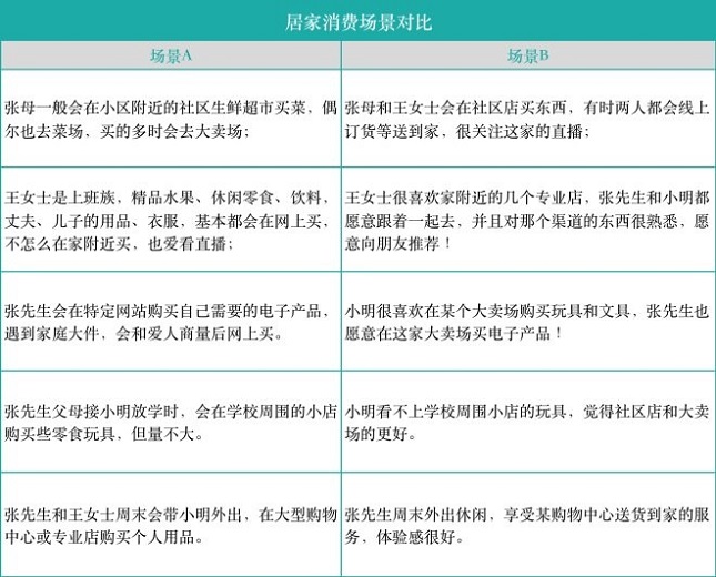 我們說(shuō)的這個(gè)“到位”,是指在顧客的全渠道場(chǎng)景中,占據(jù)主場(chǎng)景份額!拿家庭來(lái)舉例子,比如張先生、張?zhí)?、小明、張父、張母一?口,可能有以下A/B兩種場(chǎng)景: